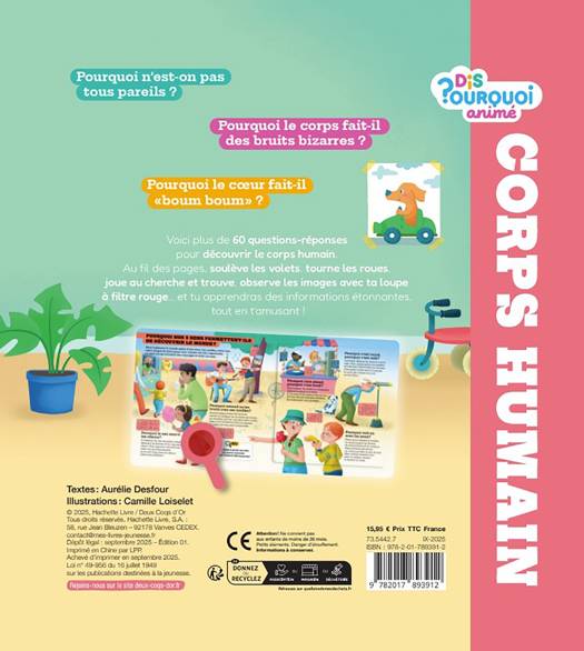 Voici plus de 60 questions-réponses pour découvrir le corps humain. Au fil des pages, soulève les volets, tourne les roues, joue au cherche et trouve, observe les images avec ta loupe à filtre rouge... et tu apprendras des informations étonnantes, tout en t'amusant !
