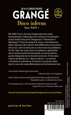 Été 1982, Paris. Un tueur frappe dans les clubs homosexuels. Il découpe ses victimes à la machette et leur brûle la bouche. Vengeance ? Obsession ? Désespoir ? Sous le sang et le strass, trois électrons libres, liés pour des raisons très différentes à cet univers de la nuit, vont se retrouver sur les traces du prédateur. Un flic, bien sûr, mais aussi un médecin, spécialiste de la communauté homosexuelle, et une lycéenne, partie intégrante de ce monde nocturne. Il n’est plus l’heure de danser sur « Disco inferno ». La chasseà l’homme a commencé. Et moins il y aura de soleil, plus il y aura de sang. Bienvenue sur les traces du mal.