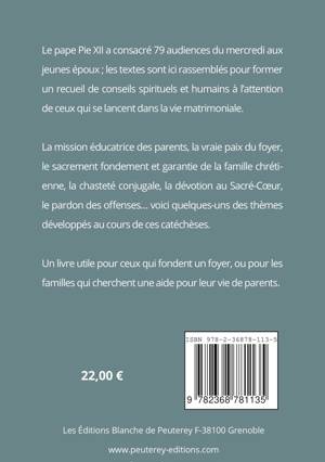 Le pape Pie XII a consacré 79 audiences du mercredi aux jeunes époux ; les textes sont ici rassemblés pour former un recueil de conseils spirituels et humains à l'attention de ceux qui se lancent dans la vie matrimoniale. La mission éducatrice des parents, la vraie paix du foyer, le sacrement fondement et garantie de la famille chrétienne, la chasteté conjugale, la dévotion au Sacré-Coeur, le pardon des offenses... voici quelques-uns des thèmes développés au cours de ces catéchèses. Un livre utile pour ceux qui fondent un foyer, ou pour les familles qui cherchent une aide pour leur vie de parents.