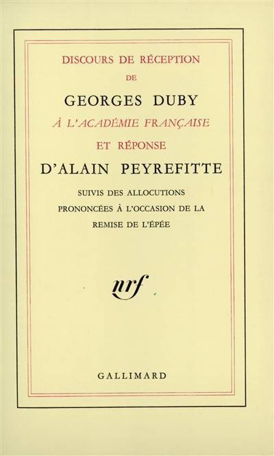 Discours de réception de Georges Duby à l'Académie française et réponses d'Alain Peyrefitte