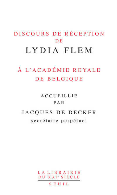 Discours de réception de Lydia Flem à l'Académie royale de Belgique accueillie par Jacques de Decker.