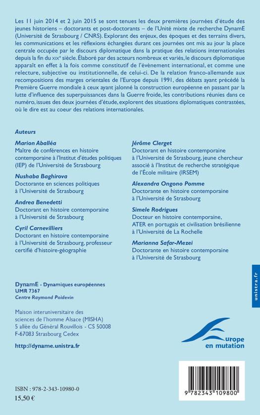 Les réflexions échangées durant les journées d'étude des jeunes historiens de l'Unité mixte de recherche DynamE (Université de Strasbourg / CNRS), tenues les 11 juin 2014 et 2 juin 2015, ont mis au jour la place centrale occupée par le discours diplomatique dans la pratique des relations internationales depuis la fin du XIXe siècle. Explorant des enjeux, des époques et des terrains divers, ces contributions mettent en lumière des situations diplomatiques contrastées, où le dire est au cur des relations internationales.