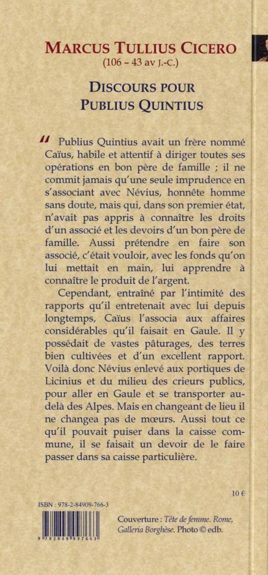 « Publius Quintius avait un frère nommé Caïus, habile et attentif à diriger toutes ses opérations en bon père de famille ; il ne commit jamais qu'une seule imprudence en s'associant avec Névius, honnête homme sans doute, mais qui, dans son premier état, n'avait pas appris à connaître les droits d'un associé et les devoirs d'un bon père de famille. Aussi prétendre en faire son associé, c'était vouloir, avec les fonds qu'on lui mettait en main, lui apprendre à connaître le produit de l'argent.