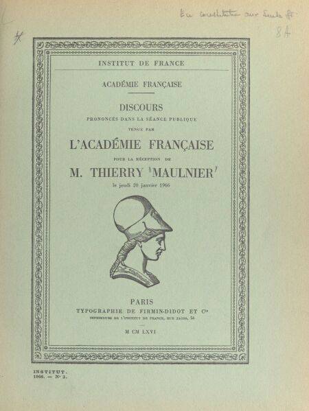 7. Discours prononcés dans la séance publique tenue par l'Académie française pour la réception de M. Thierry Maulnier, le jeudi 20 janvier 1966