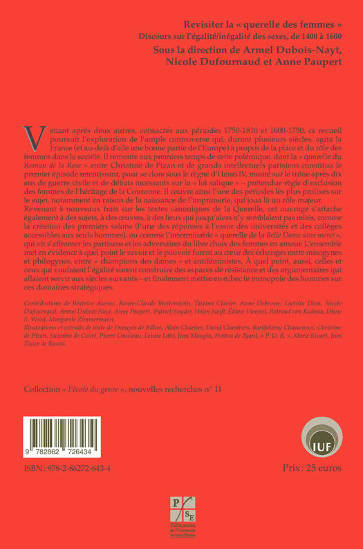 Second volet du programme de recherche consacré à l'histoire de la controverse sur la place et le rôle des femmes dans la société. Après avoir évoqué les origines de la querelle et son ancrage dans le XVe siècle, les contributions abordent une période au cours de laquelle les thèmes misogynes sont plus largement diffusés du fait de l'imprimerie. Etude sur une redéfinition de la place des femmes.