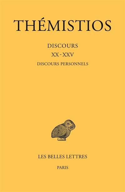 Après trois volumes axés sur la « politique », les discours « personnels » font connaître plus intimement l’orateur-philosophe païen Thémistios, grâce à l’oraison funèbre de son père Eugénios et de son attachement au néoplatonisme (XX) ou à travers la polémique contemporaine (XXI : Expert ou Philosophe – XXIII : Sophiste), quoique la philosophie spéculative n’ait pas ici perdu ses droits (XXII : De l’amitié), ni la rhétorique (XXV : Sur l’improvisation) ou la critique littéraire (XXIV : Exhortation à se tourner vers la philosophie). La prose demeure subtile, bien qu’un peu moins tendue que dans les tomes précédents, et la traduction, assortie d’un commentaire détaillé, a essayé d’en exprimer toutes les nuances.