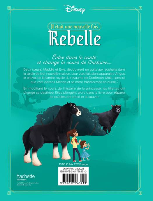 Résumé : Entre dans le conte et change le cours de l’histoire… Deux sœurs, Maddie et Evie, découvrent un puits aux souhaits dans le jardin de leur nouvelle maison. Leur vœu fait alors apparaître Angus, le cheval de la famille royale du royaume de DunBroch. Mais, sans lui, que vont devenir Merida et sa mère transformée en ourse ? En modifiant le cours de l’histoire de la princesse, les fillettes ont changé sa destinée. Elles plongent alors dans le livre pour réparer ce qu’elles ont brisé et la sauver.