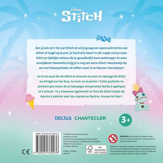 Cette jolie pochette ne contient pas moins de 50 tatouages temporaires de Stitch, que tu pourras appliquer et enlever facilement. Tu trouveras en plus un livre de Stitch rempli de dessins à colorier avec tes crayons ou feutres. Un cadeau original pour tous les fans de Stitch !