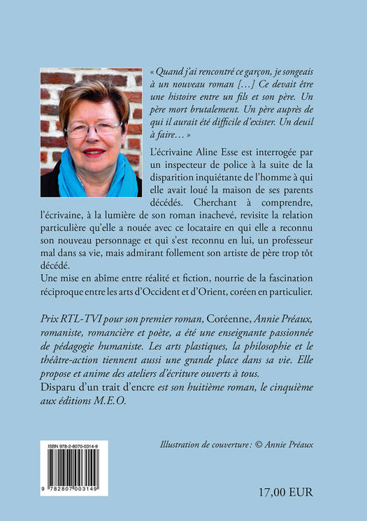 «âQuand j’ai rencontré ce garçon, je songeais à un nouveau roman [â-] Ce devait être une histoire entre un fils et son père. Un père mort brutalement. Un père auprès de qui il aurait été difficile d’exister. Un deuil à faireâ-â» L’écrivaine Aline Esse est interrogée par un inspecteur de police à la suite de la disparition inquiétante de l’homme à qui elle avait loué la maison de ses parents décédés. Cherchant à comprendre, l’écrivaine, à la lumière de son roman inachevé, revisite la relation particulière qu’elle a nouée avec ce locataire en qui elle a reconnu son nouveau personnage et qui s’est reconnu en lui, un professeur mal dans sa vie, mais admirant follement son artiste de père trop tôt décédé. Une mise en abîme entre réalité et fiction, nourrie de la fascination réciproque entre les arts d’Occident et d’Orient, coréen en particulier.