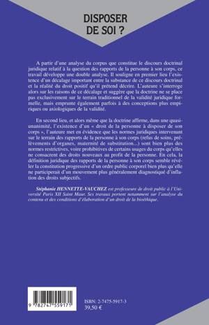 A partir d'une analyse du corpus que constitue le discours doctrinal juridique relatif à la question des rapports de la personne à son corps, ce travail souligne en premier lieu l'existence d'un décalage important entre la substance de ce discours et la réalité du droit positif qu'il prétend décrire. En second, il met en évidence que les normes juridiques intervenant sur le terrain des rapports de la personne à son corps (refus de soins, prélèvements d'organes...) sont bien plus des normes restrictives, voire prohibitives qu'elles ne consacrent des droits nouveaux au profit de la personne.