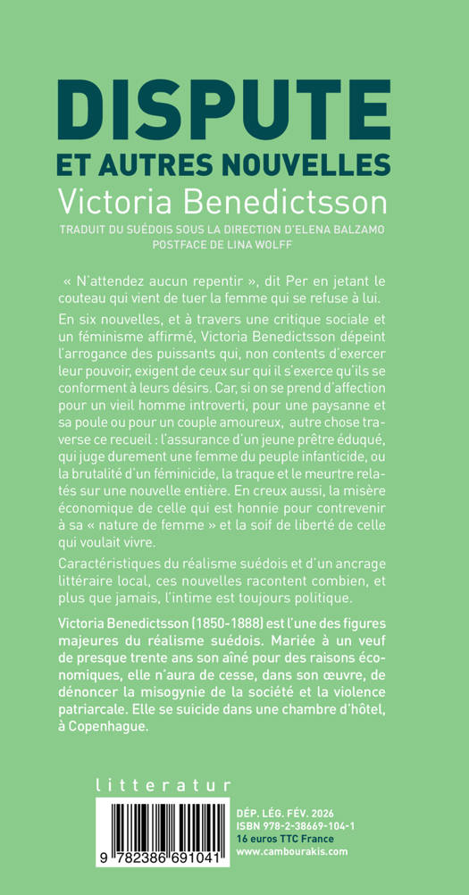« N'attendez aucun repentir », dit Per en jetant le couteau qui vient de tuer la femme qui se refuse à lui. En six nouvelles, et à travers une critique sociale et un féminisme affirmé, Victoria Benedictsson dépeint l'arrogance des puissants qui, non contents d'exercer leur pouvoir, exigent de ceux sur qui il s'exerce qu'ils se conforment à leurs désirs. Car, si on se prend d'affection pour un vieil homme introverti, pour une paysanne et sa poule ou pour un couple amoureux, autre chose traverse ce recueil : l'assurance d'un jeune prêtre éduqué, qui juge durement une femme du peuple infanticide, ou la brutalité d'un féminicide, la traque et le meurtre relatés sur une nouvelle entière. En creux aussi, la misère économique de celle qui est honnie pour contrevenir à sa « nature de femme » et la soif de liberté de celle qui voulait vivre. Caractéristiques du réalisme suédois et d'un ancrage littéraire local, ces nouvelles racontent combien, et plus que jamais, l'intime est toujours politique.