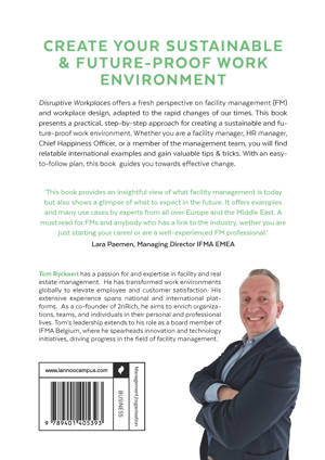 Disruptive Workplaces offers a fresh perspective on facility management (FM) and workplace design, adapted to the rapid changes of our times. This book presents a practical, step-by-step approach for creating a sustainable and future-proof work environment. Whether you are a facility manager, HR manager, Chief Happiness Officer, or a member of the management team, you will find relatable international examples and gain valuable tips & tricks. With an easy-to-follow plan, this book guides you towards effective change.