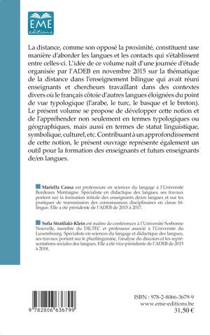 La distance, comme son opposé la proximité, constituent une manière d'aborder les langues et les contacts qui s'établissent entre celles-ci. L'idée de ce volume naît d'une journée d'étude organisée par l'ADEB en novembre 2015 sur la thématique de la distance dans l'enseignement bilingue qui avait réuni enseignants et chercheurs travaillant dans des contextes divers où le français côtoie d'autres langues éloignées du point de vue typologique (l'arabe, le turc, le basque et le breton).