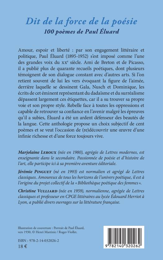 Amour, espoir et liberté par son engagement littéraire et politique, Paul ÉLUARD (1895-1952) s'est imposé comme l'une des grandes voix du XXe siècle. Ami de Breton et de Picasso, il a publié plus de quarante recueils poétiques, dont plusieurs témoignent de son dialogue constant avec d'autres arts. Si l'on retient souvent de lui les vers évoquant la figure de l'aimée, derrière laquelle se dessinent Gala, Nusch et Dominique, les écrits de cet éminent représentant du dadaïsme et du surréalisme dépassent largement ces étiquettes, car il a su trouver sa propre voie et son propre style. Rebelle face à toutes les oppressions et capable de retrouver sa confiance en l'avenir malgré les épreuves qu'il a subies, Éluard a été un ardent défenseur des beautés de la langue. Cette anthologie propose un choix subjectif de cent poèmes et se veut l'occasion de (re)découvrir une oeuvre d'une infinie richesse et d'une force toujours vive.