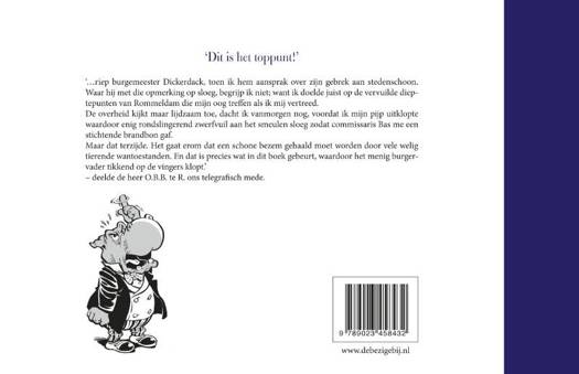 ` riep burgemeester Dickerdack, toen ik hem aansprak over zijn gebrek aan stedenschoon. Waar hij met die opmerking op sloeg, begrijp ik niet; want ik doelde juist op de vervuilde dieptepunten van Rommeldam die mijn oog treffen als ik mij vertreed. De overheid kijkt maar lijdzaam toe, dacht ik vanmorgen nog, voordat ik mijn pijp uitklopte waardoor enig rondslingerend zwerfvuil aan het smeulen sloeg zodat commissaris Bas me een stichtende brandbon gaf. Maar dat terzijde. Het gaat erom dat een schone bezem gehaald moet worden door vele welig tierende wantoestanden. En dat is precies wat in dit boek gebeurt, waardoor het menig burgervader tikkend op de vingers klopt. deelde de heer O.B.B. te R. ons telegrafisch mede.