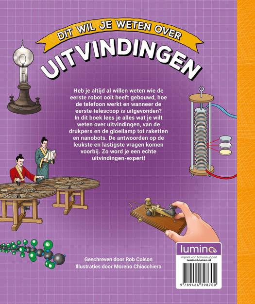Wat is de allereerste uitvinding ooit? Hoe zijn mensen op het idee gekomen voor de elektrische batterij? En hoe komt het dat een raket niet terugvalt op aarde als hij de ruimte in wordt geschoten? In dit boek krijg je antwoord op al je vragen over verschillende uitvindingen, van de drukpers tot de gloeilamp en van raketten tot nanobots. Zo word je een echte uitvindingen-expert!