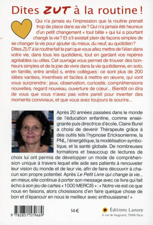 Qui n'a jamais eu l'impression que la routine prenait trop de place dans sa vie ? Qui n'a jamais été heureux d'un petit changement «tout bête» qui lui a pourtant changé la vie ? Et s'il existait plein de façons simples de se changer la vie pour ajouter du mieux, du neuf, au quotidien ? Dites ZUT à la routine fait le pari que vous allez mettre de l'élan dans votre vie, dans tous les quotidiens, tout en gardant vos repères agréables ou utiles. Cet ouvrage vous permet de trouver des bonheurs simples et de la joie de vivre dans la vie quotidienne, en solo, en famille, entre ami(e)s, entre collègues : ce sont plus de 200 idées variées, inventives et faciles à mettre en oeuvre, qui vont vous surprendre : jeux, observation, curiosité, compréhensions nouvelles, regard nouveau, ouverture de coeur... Bientôt on dira de vous que vous n'avez pas votre pareil pour inventer des moments conviviaux, et que vous avez toujours le sourire...