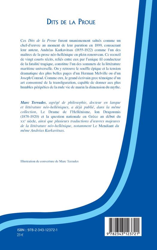 Ces Dits de la Proue furent unanimement salués comme un chef-d'œuvre au moment de leur parution en 1899, consacrant Andréas Karkavitsas comme l'un des maîtres de la prose néo-hellénique. Ce recueil de vingt courts récits, reliés entre eux par le fil conducteur de la fatalité tragique, constitue l'un des sommets de la littérature maritime universelle. On y retrouve le souffle épique et la tension dramatique d'un Melville ou d'un Conrad. Comme eux, le grand écrivain grec donne aux plus humbles péripéties de la rude vie de marin la dimension du mythe.