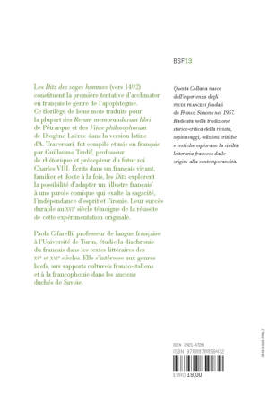 Les Ditz des sages hommes (vers 1492) constituent la première tentative d’acclimater en français le genre de l’apophtegme.<br /> Ce florilège de bons mots traduits pour la plupart des Rerum memorandarum libri de Pétrarque et des Vitae philosophorum de Diogène Laërce dans la version latine d’A. Traversari fut compilé et mis en français par Guillaume Tardif, professeur de rhétorique et précepteur du futur roi Charles VIII. Écrits dans un français vivant, familier et docte à la fois, les Ditz explorent la possibilité d’adapter un ‘illustre français’ à une parole comique qui exalte la sagacité, l’indépendance d’esprit et l’ironie. Leur succès durable au XVIe siècle témoigne de la réussite de cette expérimentation originale.