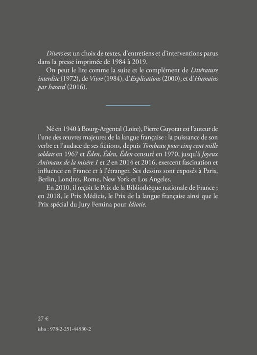 Divers est un choix de textes, d’entretiens et d’interventions parus dans la presse imprimée de 1984 à 2019.