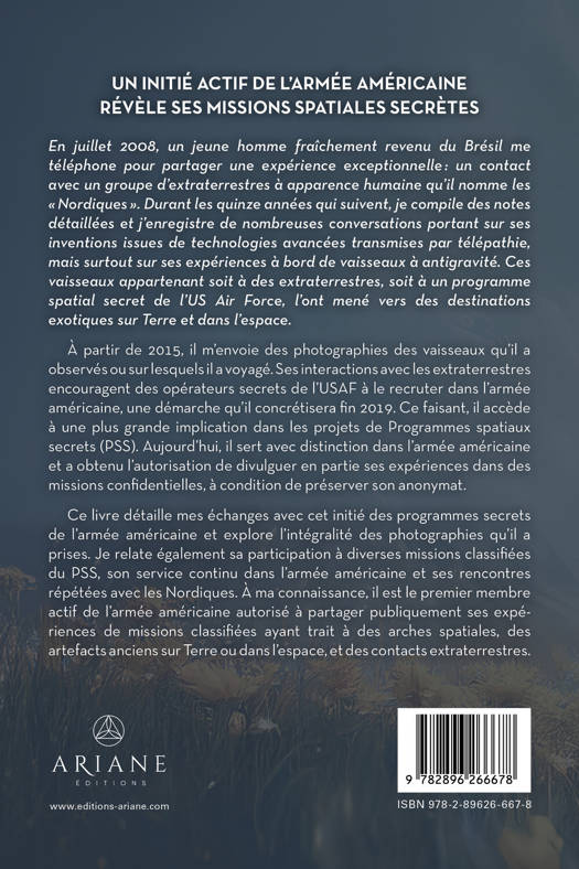 En juillet 2008, un jeune homme fraîchement revenu du Brésil me téléphone pour partager une expérience exceptionnelle : un contact avec un groupe d’extraterrestres à apparence humaine qu’il nomme les « Nordiques ». Durant les quinze années qui suivent, je compile des notes détaillées et j’enregistre de nombreuses conversations portant sur ses inventions issues de technologies avancées transmises par télépathie, mais surtout sur ses expériences à bord de vaisseaux à antigravité. Ces vaisseaux appartenant soit à des extraterrestres, soit à un programme spatial secret de l’US Air Force, l’ont mené vers des destinations exotiques sur Terre et dans l’espace. À partir de 2015, il m’envoie des photographies des vaisseaux qu’il a observés ou sur lesquels il a voyagé. Ses interactions avec les extraterrestres encouragent des opérateurs secrets de l’USAF à le recruter dans l’armée américaine, une démarche qu’il concrétisera fin 2019. Ce faisant, il accède à une plus grande implication dans les projets de Programmes spatiaux secrets (PSS). Aujourd’hui, il sert avec distinction dans l’armée américaine et a obtenu l’autorisation de divulguer en partie ses expériences dans des missions confidentielles, à condition de préserver son anonymat. Ce livre détaille mes échanges avec cet initié des programmes secrets de l’armée américaine et explore l’intégralité des photographies qu’il a prises. Je relate également sa participation à diverses missions classifiées du PSS, son service continu dans l’armée américaine et ses rencontres répétées avec les Nordiques. À ma connaissance, il est le premier membre actif de l’armée américaine autorisé à partager publiquement ses expériences de missions classifiées ayant trait à des arches spatiales, des artefacts anciens sur Terre ou dans l’espace, et des contacts extraterrestres.