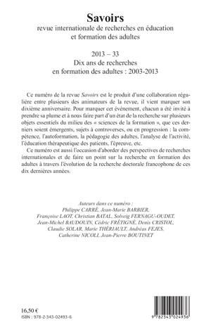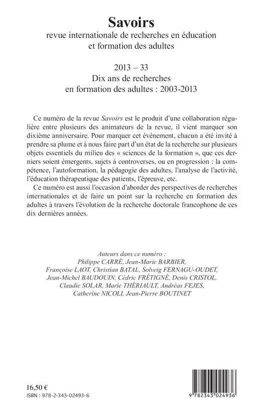 Ce numéro de la revue Savoirs est le produit d'une collaboration régulière entre plusieurs des animateurs de la revue, il vient marquer son dixième anniversaire. Pour marquer cet événement, chacun a été invité à prendre sa plume et à nous faire part d'un état de la recherche sur plusieurs objets essentiels du milieu des « sciences de la formation » : la compétence, l'autoformation, la pédagogie des adultes, l'analyse de l'activité, l'éducation thérapeutique des patients, l'épreuve, etc.