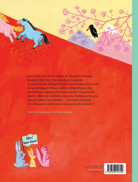 Après Dix petits chevaux fêtent Noël, de nouvelles aventures des dix amis qui se lancent cette fois-ci le défi d'arriver le plus vite possible au sommet. À chacun sa monture: voiture, vélo, téléphérique, locomotive ou simple galop, tous les moyens sont bons pour y accéder. Mais y aura-t-il seulement un vainqueur? Une histoire d'amitié toujours réjouissante servie par le dessin coloré fourmillant de détails de Lisen Adbage.