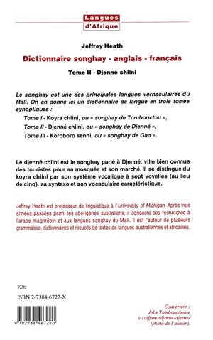 Le songhay est l'une des principales langues vernaculaires du Mali. On en donne ici un dictionnaire de langue en trois tomes synoptiques. Le djenné chiini est le songhay parlé à Djenné, ville connue des touristes pour sa moquée et son marché. Il se distingue du koyra chiini par son système vocalique à seot voyelles, sa syntaxe et son vocabulaire spécifique.