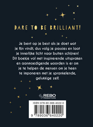 Dare to be brilliant! Je bent op je best als je doet wat je fijn vindt, dus volg je passies en laat je innerlijke licht naar buiten schijnen! Dit boekje vol met inspirerende en aanmoedigende woorden is er om je te helpen de mensen om je heen te imponeren met je sprankelende, gelukkige zelf.