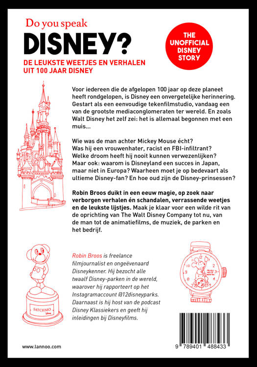 Voor iedereen die de afgelopen 100 jaar op deze planeet heeft rondgelopen, is Disney een onvergetelijke herinnering. Gestart als een eenvoudige tekenfilmstudio, vandaag een van de grootste mediaconglomeraten ter wereld. En zoals Walt Disney het zelf zei: het is allemaal begonnen met een muis... Wie was de man achter Mickey Mouse écht? Was hij een vrouwenhater, racist en FBI-infiltrant? Welke droom heeft hij nooit kunnen verwezenlijken? Maar ook: waarom is Disneyland een succes in Japan, maar niet in Europa? Waarheen moet je op bedevaart als ultieme Disney-fan? En hoe oud zijn de Disney-prinsessen? Robin Broos duikt in een nieuwe magie, op zoek naar verborgen verhalen én schandalen, verrassende weetjes en de leukste lijstjes. Maak je klaar voor een wilde rit van de oprichting van The Walt Disney Company tot nu, van de man tot de animatiefilms, de muziek, de parken en het bedrijf.