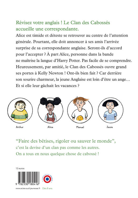 Révisez votre anglais ! Le Clan des Cabossés accueille une correspondante. Alice est timide et déteste se retrouver au centre de l'attention générale. Pourtant, elle doit annoncer à ses amis l'arrivée surprise de sa correspondante anglaise. Seront-ils d'accord pour l'accepter ? À part Alice, personne dans la bande ne maîtrise la langue d'Harry Potter. Pas facile de se comprendre. Heureusement, par amitié, le Clan des Cabossés ouvre grand ses portes à Kelly Newton ! Ont-ils bien fait ? Car derrière son sourire charmeur, la jeune Anglaise est loin d'être un ange... Et si elle leur gâchait les vacances ?