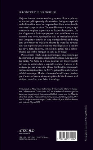 Un jeune homme commotionné et gravement blessé se présente au poste de police pour signaler un crime. Les agents dépêchés sur les lieux découvrent les cinq membres d'une même famille massacrés à coups de pierre. Tout semble accuser le garçon, qui se trouvait sur place et porte sur lui l'ADN des victimes. Un être d'apparence docile qui pourrait tout aussi bien être un monstre, et se révèle, quoi qu'il en soit, un manipulateur hors pair. L'enquête se déroule en cinq journées de vent et de sang dans une Barcelone endolorie, théâtre de toutes les névroses pour un inspecteur aux intuitions plus fulgurantes à mesure que sa vie part à la dérive, cerné comme jamais par la schizophrénie qui semble marquer les siens au fer rouge. Pointant sans relâche un pouvoir arrogant et corrompu qui de génération en génération sacrifie les fragiles au faste tapageur des nantis, Aro Sáinz de la Maza poursuit son épopée sociale sur fond de crimes dans la capitale catalane. Il dresse ici le saisissant portrait d'une ville blessée (profondément marquée par les attentats islamistes de 2017), qui semble nimbée d'une irréalité fantastique. Des êtres bouleversés se déchirent pendant que d'autres se lancent dans une quête effrénée d'
