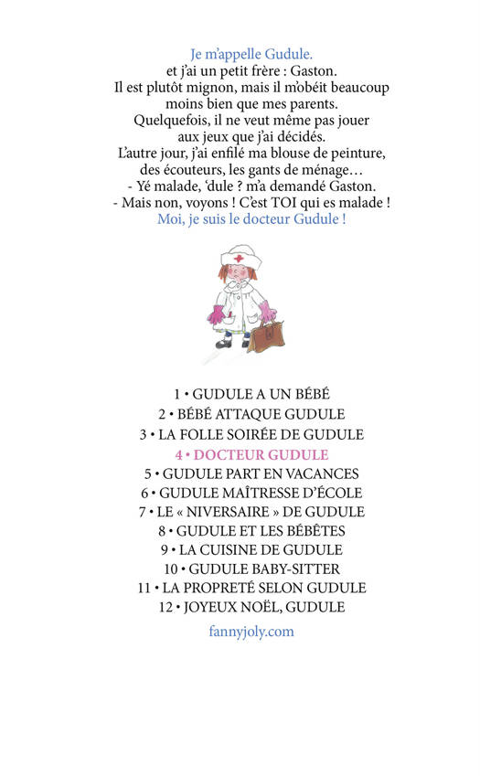 Je m’appelle Gudule et j’ai un petit frère : Gaston. Il est plutôt mignon, mais il m’obéit beaucoup moins bien que mes parents. Quelquefois, il ne veut même pas jouer aux jeux que j’ai décidés. L’autre jour, j’ai enfilé ma blouse de peinture, des écouteurs, les gants de ménage... - Yé malade, ‘dule ? m’a demandé Gaston. - Mais non, voyons ! C’est TOI qui es malade ! Moi, je suis le docteur Gudule !