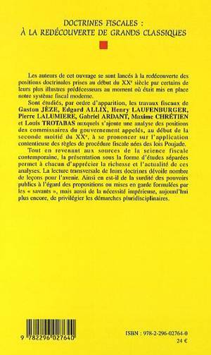Voici une redécouverte des travaux fiscaux de G. Jèze, E. Allix, H. Laufenburger, P. Lalumière, G. Ardant, M. Chrétien et L. Trotabas, auxquels s'ajoutent des contributions du début de la seconde moitié du XXe siècle. Ce retour aux sources de la science fiscale contemporaine permet d'apprécier la richesse et l'actualité de ces analyses.