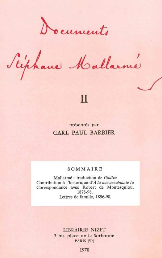 Ce second tome des Documents Stephane Mallarme revele le poete, le traducteur et surtout l'epistolier. A la nue accablante tu, ecrit en 1887 ou 1888 et publie en 1895, est l'une des compositions les plus difficiles de Mallarme. Ce sonnet a beaucoup alimente la polemique d'alors concernant la poesie des symbolistes en general, et celle de Mallarme en particulier. Quelques precisions relatives a l'historique de la publication du poeme controverse sont ici donnees. Mallarme, on le sait, a traduit plusieurs poetes anglo-saxons, notamment Edgar Allan Poe. La traduction qu'il donna de la celebre Godiva, poeme d'Alfred Tennyson (1809-1892), resta inedite jusqu'en 1970...Le brouillon de cette traduction, meticuleusement reproduit par Carl Paul Barbier, est donc bien precieux. Mais ce tome laisse la part belle a l'epistolier. On trouvera d'abord la correspondance (souvent pittoresque) avec Robert de Montesquiou, s'etalant sur vingt annees, puis le "morceau de choix" les lettres, si pleines d'affections, de charme (un ronronnement de chat) entre Mallarme et "ses Dames", sa femme et sa fille Genevieve. Echanges d'autant plus touchants qu'ils occupent les deux dernieres annees de la vie du poete. Une quinzaine de jours avant sa mort, le "Papa" ecrit a sa fille: "Un orage, que nous eussions retenu a pleins bras, a passe sur le pays (...) le travail de l'apres-midi a fondu"...