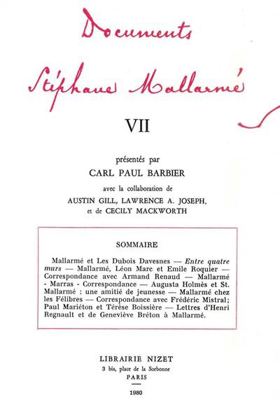 Ce Tome VII des Documents Mallarmé est largement consacré à la correspondance du poète avec ses amis, écrivains ou non. On trouvera également une édition des poèmes de Mallarmé lycéen.