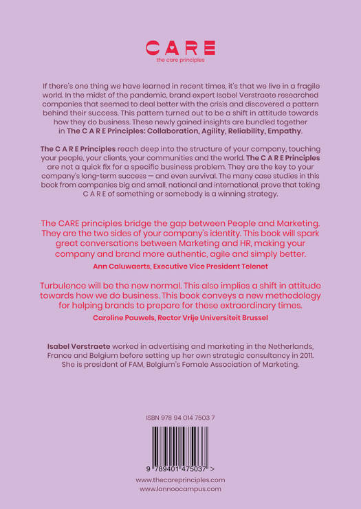 If there's one thing we have learned in recent times, it's that we live in a fragile world. In the midst of the pandemic, brand expert Isabel Verstraete researched companies that seemed to deal better with the crisis and discovered a pattern behind their success. This pattern turned out to be a shift in attitude towards how they do business. These newly gained insights are bundled together in The C A R E Principles: Collaboration, Agility, Reliability, Empathy. The C A R E Principles reach deep into the structure of your company, touching your people, your clients, your communities and the world. The C A R E Principles are not a quick fix for a specific business problem. They are the key to your company's long-term success - and even survival. The many case studies in this book from companies big and small, national and international, prove that taking C A R E of something or somebody is a winning strategy.