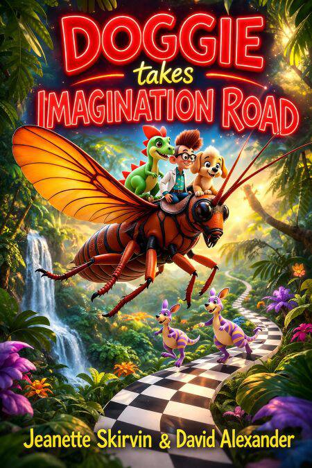Doggie of Side Streets' world is about to change drastically as the lovable pup of #1Corrugated Box sets out on a fantastic and amazing journey down IMAGINATION ROAD which takes him on a journey to the Center of the Earth and back again. In the course of this great adventure, Doggie makes new discoveries and new friends who help him find his way. First, there are the Kangaroo Twins, who've found a big dinosaur egg amid a pile of mysterious things including a big adventurer's hat. Then Bigosaurus pecks his way out of the dinosaur egg and cries for his mommy and daddy. Down the checkerboard IMAGINATION ROAD, the Kangaroo Twins, Doggie and Bigosaurus find the Time Machine Garage where they learn that the owner of the hat, Professor Squail Foovenaut Quirky, has gone to the Center of the Earth, where Bigosaurus' (Bigo" for short) mommy and daddy dinosaurs are looking for their baby at their home in Jurassic Jungle. Helped by friendly Octopus Trees to find the entrance to the Center of the Earth, Doggie and his friends go down a big Black Hole and there find Professor Foovenaut hung up by friendly bats who play loud rock music. Once the Kangaroo Twins get him down, Professor Foovenaut shows them the way to Jurassic Jungle where Bigo and his dinosaur mommy and daddy are reunited. By now it's getting late and Doggie has to get back to #1Corrugated Box in a hurry. Will he get back in time for supper? Find out in DOGGIE TAKES IMAGINATION ROAD by Jeanette Skirvin and David Alexander.