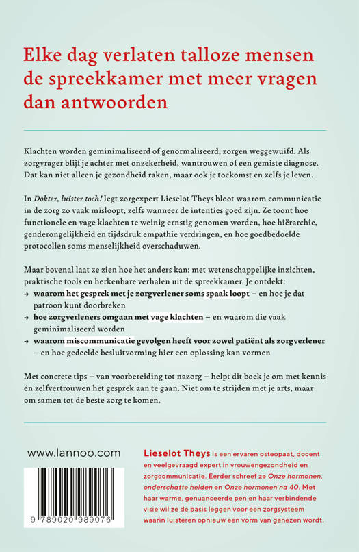 In Dokter, luister toch! legt zorgexpert Lieselot Theys bloot waarom communicatie in de zorg zo vaak misloopt, zelfs wanneer de intenties goed zijn. Ze toont hoe functionele en vage klachten te weinig ernstig genomen worden, hoe hiërarchie, genderongelijkheid en tijdsdruk empathie verdringen, en hoe goedbedoelde protocollen soms menselijkheid overschaduwen.
