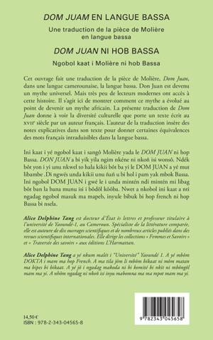 Cet ouvrage fait une traduction de la pièce de Molière, Dom Juan, dans une langue camerounaise, la langue bassa, et donne à voir la diversité culturelle que porte un texte écrit au XVIIe siècle par un auteur français. Don Juan est devenu un mythe universel mais très peu de lecteurs modernes ont accès à cette histoire, il s'agit donc de montrer ici comment ce mythe a évolué au point de devenir un mythe africain.