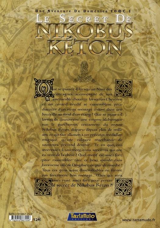 Que se passe-t-il lorsqu'un nain des montagnes, accompagné de son inséparable chouette, Lorsqu'un cheyenne et un renard érudit se rassemblent pour discuter d'un vieux message trouvé dans une bouteille au fond d'un étang ? Que se passe-t-il lorsqu'ils découvrent une énigme alchimique sur le parchemin, testament du moine Nikobus Kéton. Ce dernier a disparu depuis plus de mille ans et le message fait allusions à un précieux médaillon magique, que prétend détenir une vulgaire marchande de souvenirs. Et en quoi ceci intéresse-t-il vivement trois sorcières qui ont eu vent de la chose ? Quel motif est assez fort pour rassembler tout ce beau monde dans l'immense ville de DINGOBART un jour de marché ? Tous ses gens aussi dissemblables ne feront pas forcément bon ménage, et qui sera assez rusé, assez fort pour percer le secret de Nikobus Kéton ?