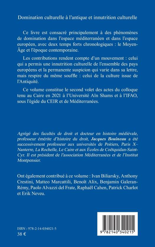 Ce livre est consacré principalement à des phénomènes de domination dans l'espace méditerranéen et dans l'espace européen, avec deux temps forts chronologiques: le Moyen-Âge et l'époque contemporaine. Les contributions rendent compte d'un mouvement: celui qui a permis une innutrition culturelle de l'ensemble des pays européens et la permanente suspicion qui varie dans sa lettre, mais respire du même souffle: celui de la culture issue de l'Antiquité. Ce volume constitue le second volet des actes du colloque tenu au Caire en 2021 à l'Université Aïn Shams et à l'IFAO, sous l'égide du CEIR et de Méditerranées.