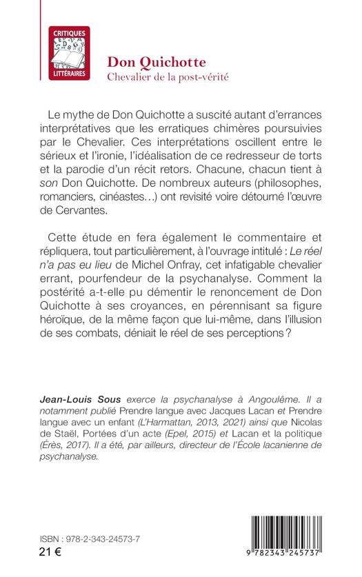 Le mythe de Don Quichotte a suscité autant d’errances interprétatives que les erratiques chimères poursuivies par le Chevalier. Ces interprétations oscillent entre le sérieux et l’ironie, l’idéalisation de ce redresseur de torts et la parodie d’un récit retors. Chacune, chacun tient à son Don Quichotte. De nombreux auteurs (philosophes, romanciers, cinéastes…) ont revisité voire détourné l’œuvre de Cervantes. Cette étude en fera également le commentaire et répliquera, tout particulièrement, à l’ouvrage intitulé : Le réel n’a pas eu lieu de Michel Onfray, cet infatigable chevalier errant, pourfendeur de la psychanalyse. Comment la postérité a-t-elle pu démentir le renoncement de Don Quichotte à ses croyances, en pérennisant sa figure héroïque, de la même façon que lui-même, dans l’illusion de ses combats, déniait le réel de ses perceptions ?