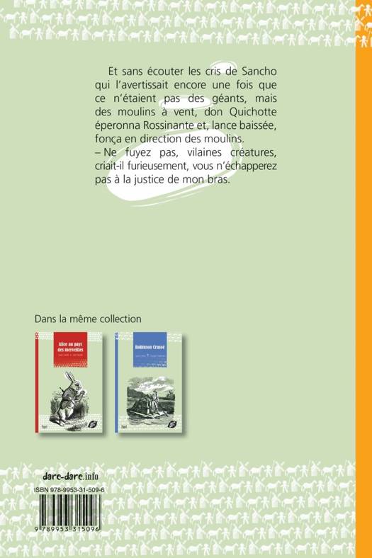 Les aventures d'un pauvre hidalgo de la Manche, Alonso Quichano, qui se prend pour le chevalier errant Don Quichotte. Sa mission est de parcourir l'Espagne pour combattre le mal et protéger les opprimés. Il prend la route, monté sur son vieux cheval, Rossinante, et accompagné d'un paysan stupide, Sancho Panza, trompé par ses promesses de récompenses extraordinaires. Adapté en lecture facile.
