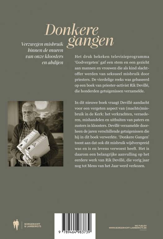 Het druk bekeken televisieprogramma 'Godvergeten' gaf een stem en een gezicht aan mannen en vrouwen die als kind slachtoffer werden van seksueel misbruik door priesters. De vierdelige reeks was gebaseerd op een boek van priester-activist Rik Devillé, die honderden getuigenissen verzamelde.In dit nieuwe boek vraagt Devillé aandacht voor een vergeten aspect van (machts)misbruik in de Kerk: het verkrachten, vernederen, mishandelen en uitbuiten van paters en zusters in kloosters. Devillé verzamelde doorheen de jaren verschillende getuigenissen die hij in dit boek verwerkte. 'Donkere Gangen' toont aan dat ook dit misbruik wijdverspreid was en is en levens verwoest heeft. Het is daarom een belangrijke aanvulling op het eerdere werk van Rik Devillé, die vorig jaar nog tot Mens van het Jaar werd verkozen.