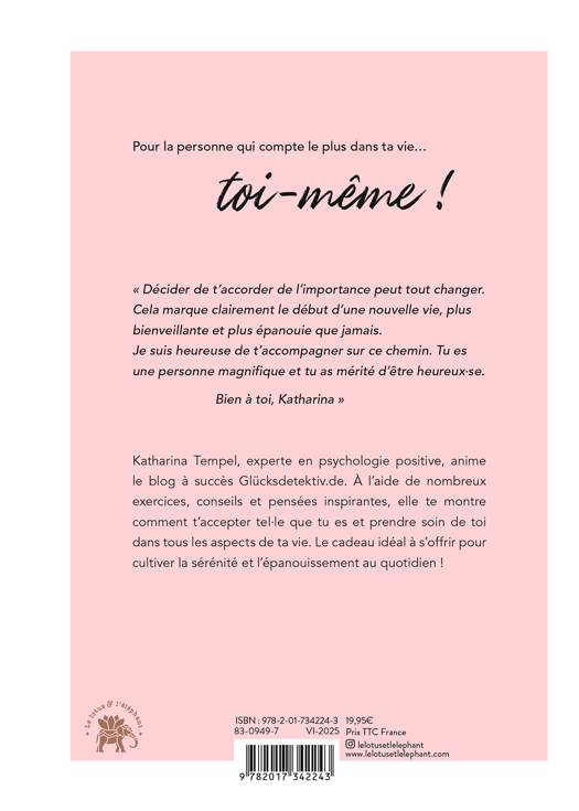 « Décider de t’accorder de l’importance peut tout changer. Cela marque clairement le début d’une nouvelle vie, plus bienveillante et plus épanouie que jamais. Je suis heureuse de t’accompagner sur ce chemin. Tu es une personne magnifique et tu as mérité d’être heureux·se. Bien à toi, Katharina »