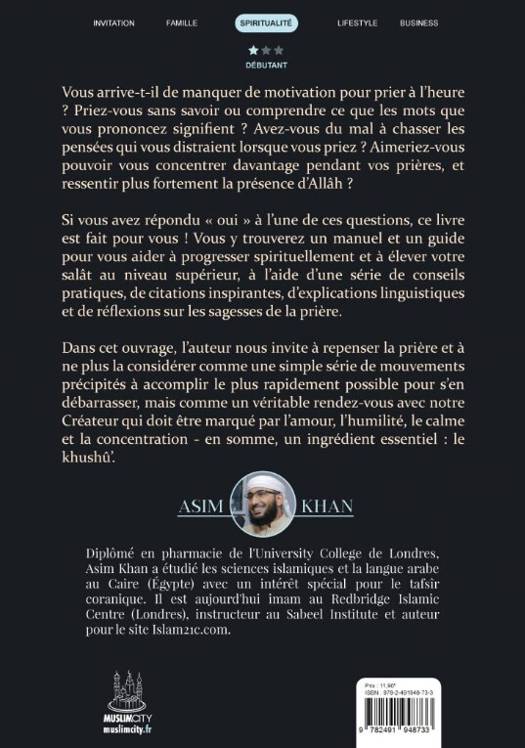 Dans cet ouvrage, l’auteur nous invite à repenser la prière et à ne plus la considérer comme une simple série de mouvements précipités à accomplir le plus rapidement possible pour s’en débarrasser, mais comme un véritable rendez-vous avec notre Créateur qui doit être marqué par l’amour, l’humilité, le calme et la concentration – en somme, un ingrédient essentiel : le khushû’.