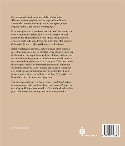 Zelfs heel moeilijke dingen komen in 'Doodgewoon' aan de orde, zoals een kind dat sterft of iemand die zelf uit het leven stapt. Het levert een prachtige verzameling troostrijke gedichten op, met schitterende illustraties van Gouden Penseel-winnares Sylvia Weve. Het boek heeft bovendien een luxe uitstraling, met drie leeslinten, een linnen rug en in breedte variërende pagina's.