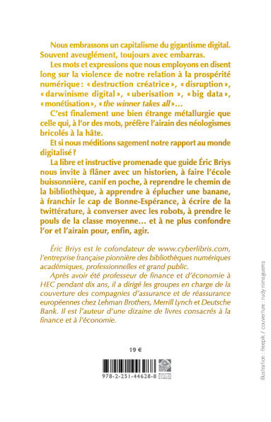 Nous embrassons un capitalisme du gigantisme digital. Souvent aveuglément, toujours avec embarras. Les mots et expressions que nous employons en disent long sur la violence de notre relation à la prospérité numérique : "destruction créatrice", "disruption", "darwinisme digital", "uberisation", "big data", "monétisation", "the winner takes it all"... C'est finalement une bien étrange métallurgie que celle qui, à l'or des mots, préfère l'airain des néologismes bricolés à la hâte. Et si nous méditions sagement notre rapport au monde digitalisé ? La libre et instructive promenade que guide Éric Briys nous invite à flâner avec un historien, à faire l'école buissonnière, canif en poche, à reprendre le chemin de la bibliothèque, à apprendre à éplucher une banane, à franchir le cap de Bonne-Espérance, à écrire de la twittérature, à converser avec les robots, à prendre le pouls de la classe moyenne...et à ne plus confondre l'or et l'airain, pour, enfin, agir.