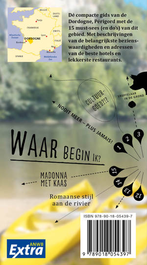 Van bovenaf gezien is de Dordogne als een sprookjeslandschap, met een rivier die eindeloos veel kronkels telt en zijn weg zoekt langs burchten, kastelen en ruïnes. De ANWB Extra reisgids Dordogne biedt naast veel praktische tips over campings, vakantiehuizen, hotels en vervoer ook 15 inspirerende bezienswaardigheden die je niet mag missen. Struin door middeleeuws dorpje Molières maak een kanotocht van kasteel naar kasteel of volg de wijnroute van Cahors.